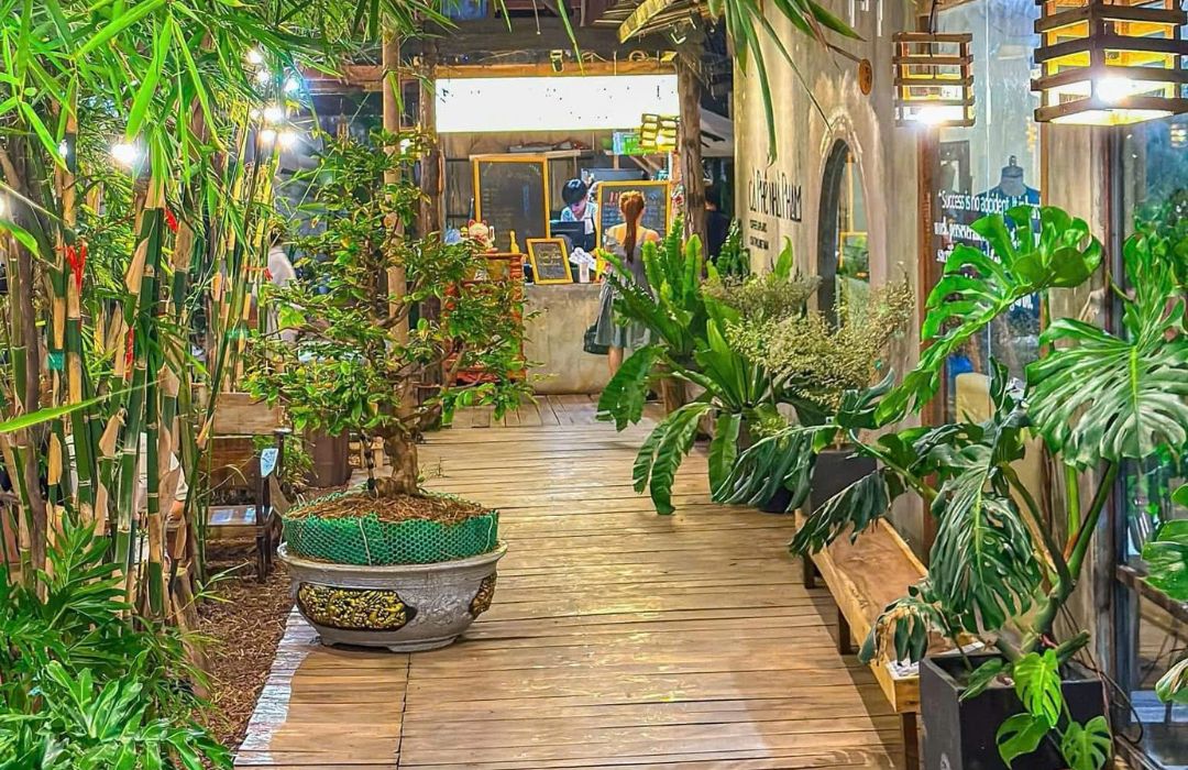 Góc cửa sổ được xem là “signature spot” của quán. Ánh sáng xuyên qua khe cửa tạo nên những mảng sáng tối đẹp mắt, rất phù hợp cho những bức ảnh chân dung nhẹ nhàng. Khu sân vườn nhỏ cũng là nơi tuyệt vời để check-in, đặc biệt vào buổi sáng khi nắng dịu.